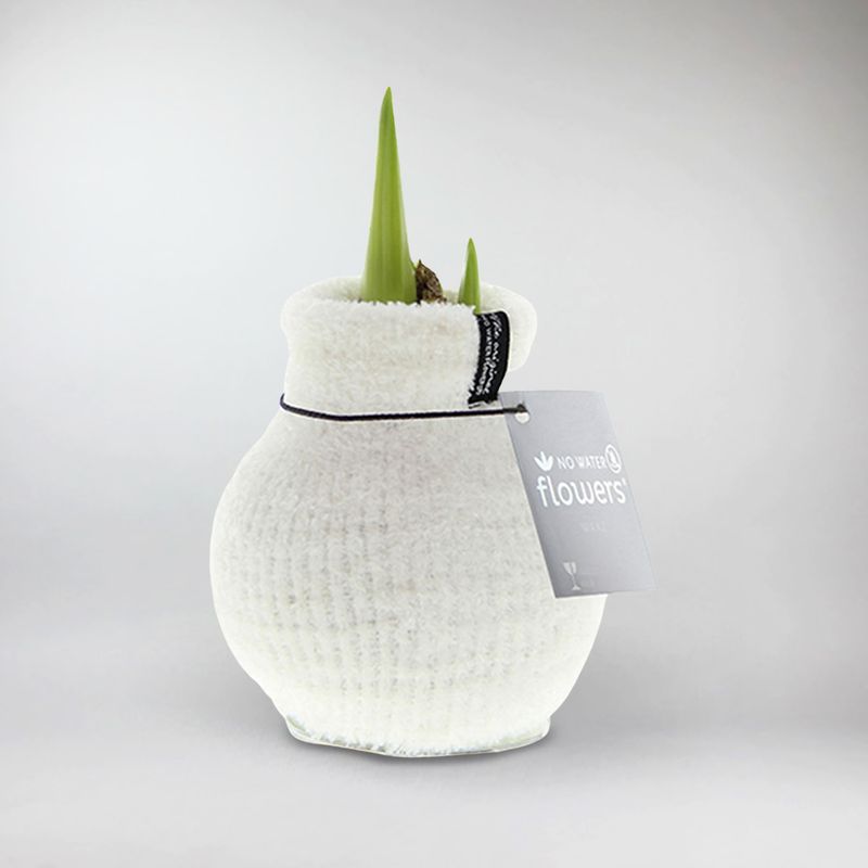 Amaryllis-Zwiebel in weißer Strickhülle – Gemütlich, fröhlich, elegant