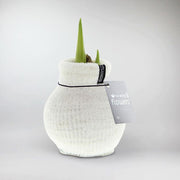 Die gestrickte Hülle verleiht Ihrer Amaryllis-Zwiebel einen weichen, behaglichen Look, der wunderschön mit den glatten, glänzenden Trompetenblüten kontrastiert. Es ist eine ganz normale Amaryllis-Zwiebel, aber sie ist festlich verpackt.