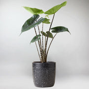 In Innenräumen erreicht die Alocasia Black Zebrina typischerweise eine Höhe von 60 bis 150 cm, abhängig von Licht und Topfgröße, mit einzelnen Blättern von 20 bis 50 cm Länge. Sie wächst aufrecht aus einem Rhizom und bildet neue vertikale Triebe, anstatt zu ranken oder zu klettern. Die Wachstumsgeschwindigkeit ist moderat. Deutliches Blattwachstum im Frühling und Sommer, langsamer in den kühleren Monaten. Stützen Sie die Pflanze mit einem stabilen Stab, falls die Stängel umknicken; topfen Sie sie alle 1 bis 2 Jahre in einen etwas größeren Topf um, um das Wachstum neuer Triebe zu fördern. Für eine besonders eindrucksvolle Wirkung wählen Sie einen Topf mit 20 bis 30 cm Durchmesser für mittelgroße Exemplare. Größere Exemplare eignen sich für Töpfe mit 30 bis 40 cm Durchmesser.