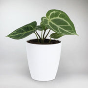 Anthurium crystallinum ist eine klassische Samtblättrige Aronstabgewächsart mit großen, herzförmigen Blättern und leuchtend hellen Adern. Die jungen Blätter entfalten sich bronzefarben, bevor sie sich zu einem satten, samtigen Grün vertiefen. Sie benötigt Wärme, gute Luftfeuchtigkeit und helles, aber indirektes Licht. Gießen Sie, sobald die obersten Zentimeter der Erde trocken sind, und verwenden Sie ein luftiges Substrat auf Rindenbasis.