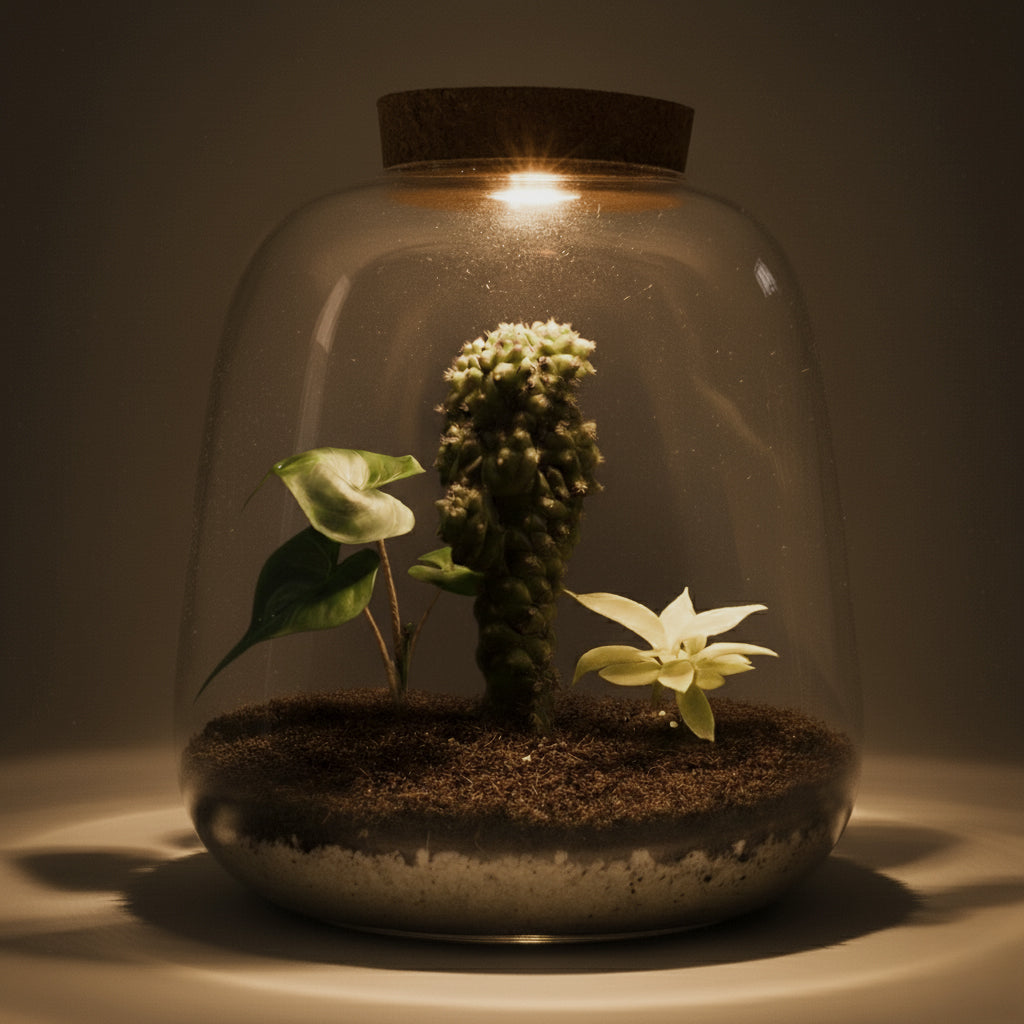 Gestalten Sie ein kompaktes, ausdrucksstarkes Terrarium, das glänzendes, mondlichtähnliches Laub, samtige, dunkle Blätter und architektonisch anmutende Sukkulentenformen vereint. Das Ray of Green Terrarium DIY-Set bietet kontrastreiche Texturen und mühelose Eleganz für Schreibtische, Regale und gemütliche Rückzugsorte.