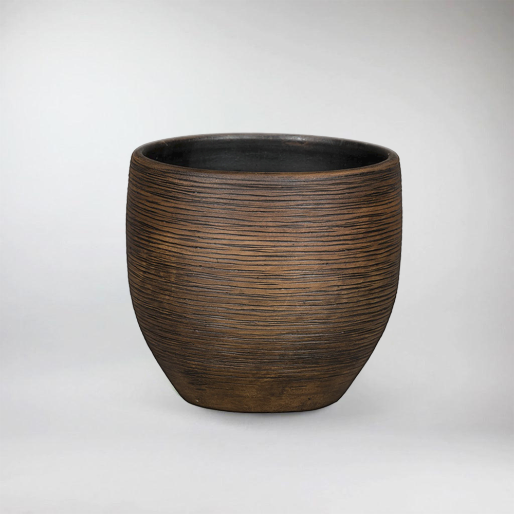 Seine satten, erdigen Farbtöne werden durch feine horizontale Rillen hervorgehoben und verleihen ihm einen handgefertigten Look, der wunderbar mit natürlichem Grün harmoniert.Sein vielseitiges Design ist perfekt, um Ihren Lieblingspflanzen mehr Tiefe zu verleihen und passt sowohl zu modernen als auch zu traditionellen Einrichtungen.